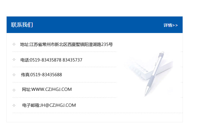 地址:常州市新北區(qū)友邦商務大廈1幢16、17層  電話:0519-85101652  傳真:0519-85112595  郵編:213022  網(wǎng)址:www_cz-jiayue_cn.cn-jieyuan.com  郵箱:xiajifengaa@163.com
